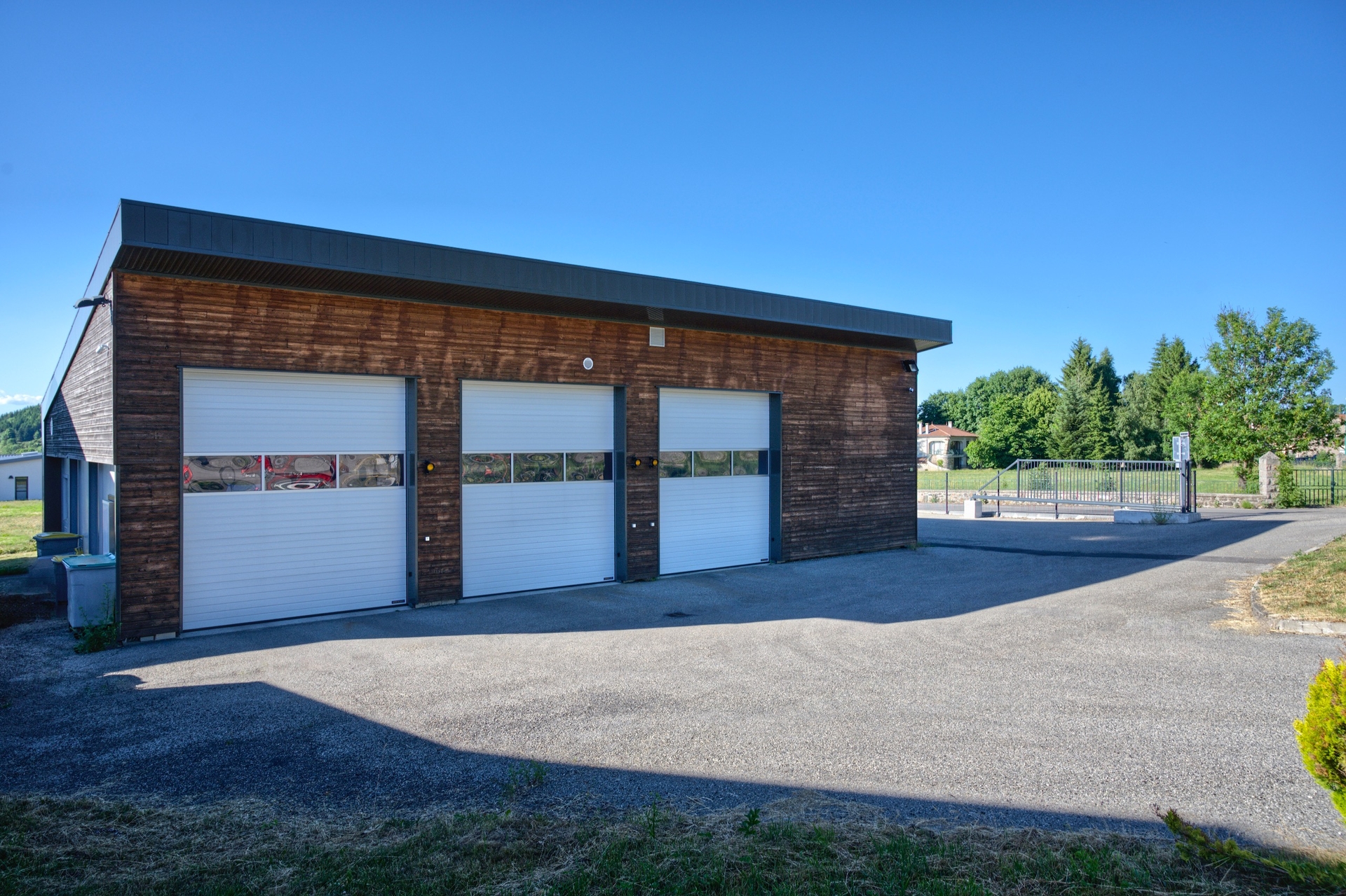Le bâtiment de garage s’intègre au projet architecturale par sa toiture en bande épaisse. Le bardage bois permet de lui donner une identité propre.