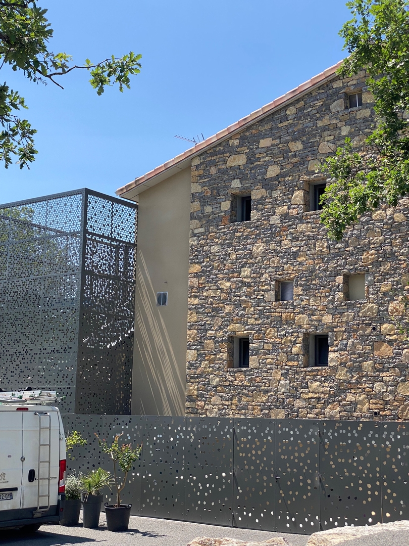 Le projet architectural s’appuie sur les caractéristiques du patrimoine local : utilisation de la pierre régionale, charpente traditionnelle et couverture en tuiles de terre cuite. Une résille métallique ajourée, apportant une touche contemporaine, vient envelopper certains volumes et tisser un lien esthétique entre les différentes constructions du site.