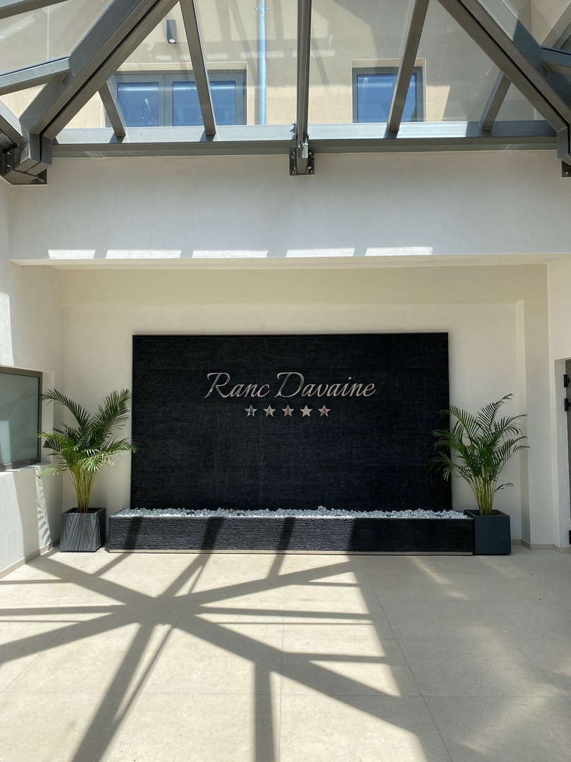 L’espace bar-restaurant affirme quant à lui un langage résolument contemporain, mêlant matériaux métalliques, minéraux et éléments naturels. Les teintes choisies dialoguent avec celles des matériaux extérieurs, renforcées par une mise en lumière soignée qui souligne l’ambiance chaleureuse des lieux.