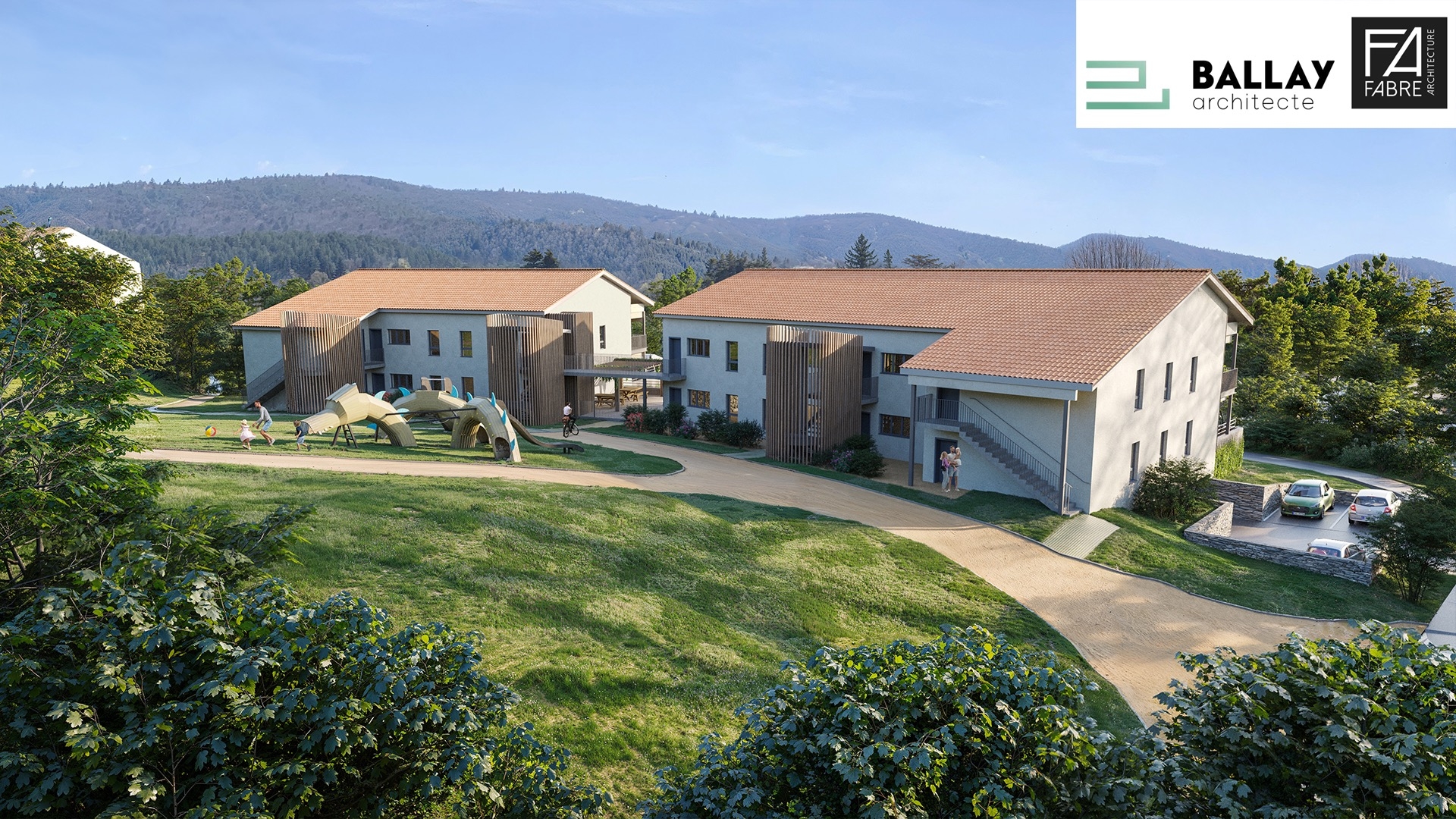 Situé en lisière du centre-ville et exposé plein sud, il propose 14 logements traversants, conçus selon les principes de l’architecture bioclimatique. Le projet s’appuie sur une structure mixte bois-béton, combinant inertie thermique, faible empreinte carbone et intégration fine dans la pente naturelle du terrain.